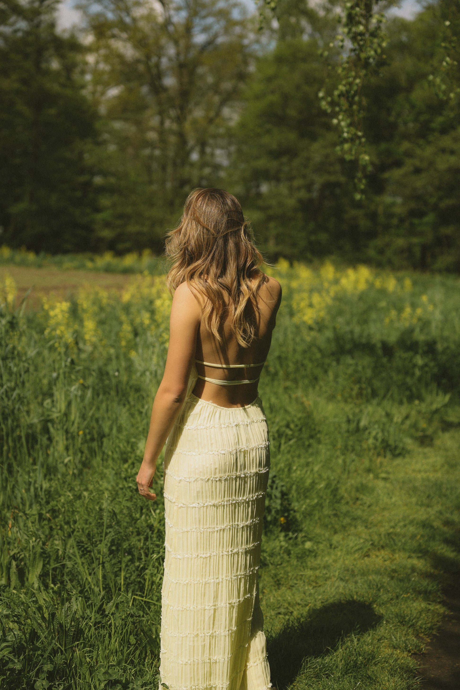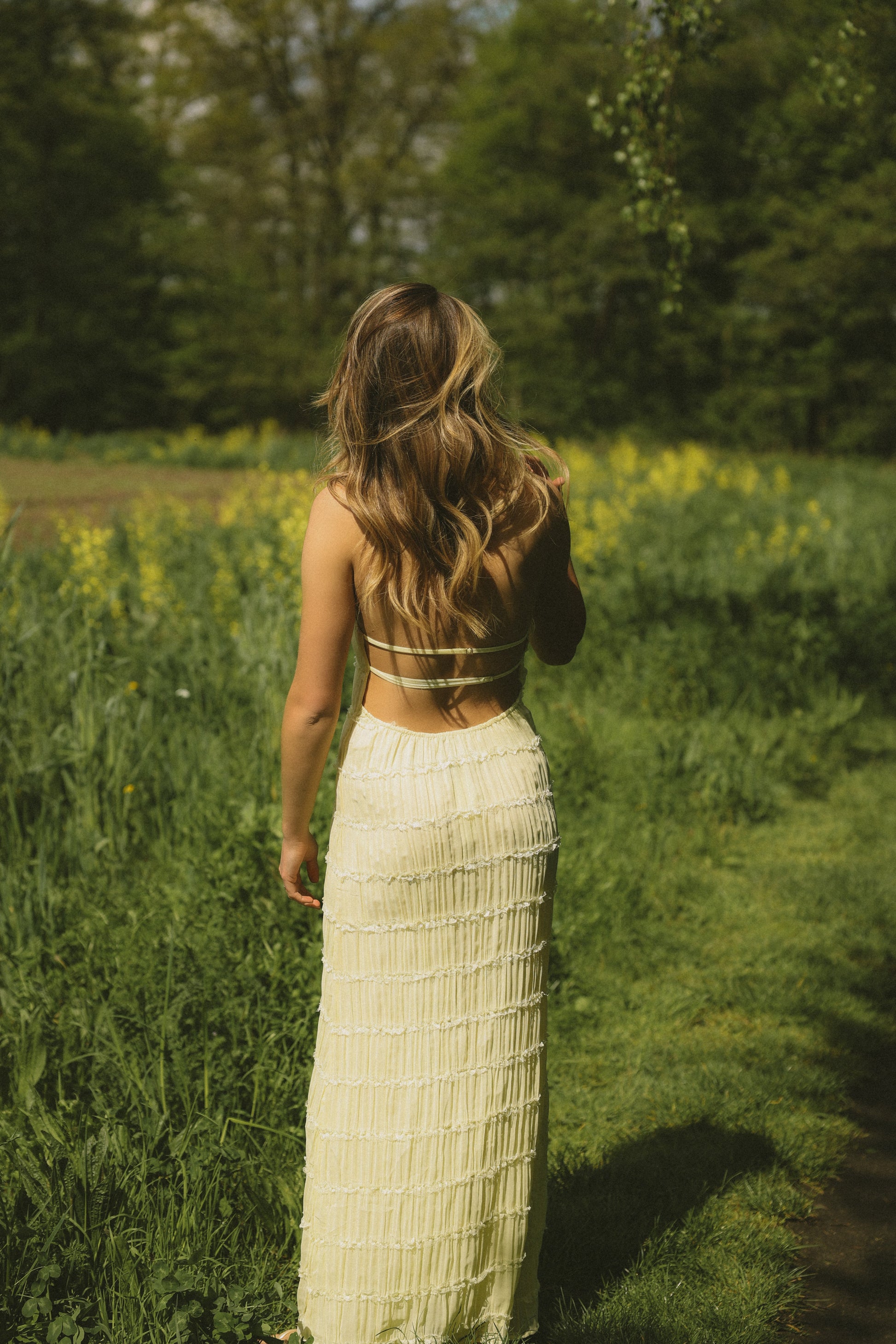 Este vestido es realmente llamativo gracias a su divertido diseño en capas y su espalda abierta con finos tirantes. La tela es suave y ligera, lo que hace que el vestido se mueva con facilidad. Perfecto para los días cálidos o una salida nocturna en verano: femenino, ligero y cómodo, todo en uno.
